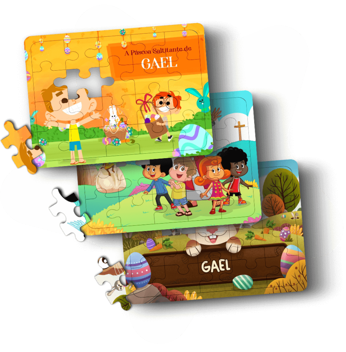 Durante este mês, comprando qualquer um dos 3 livros especiais de Páscoa, você leva um quebra-cabeça personalizado do livro de presente!